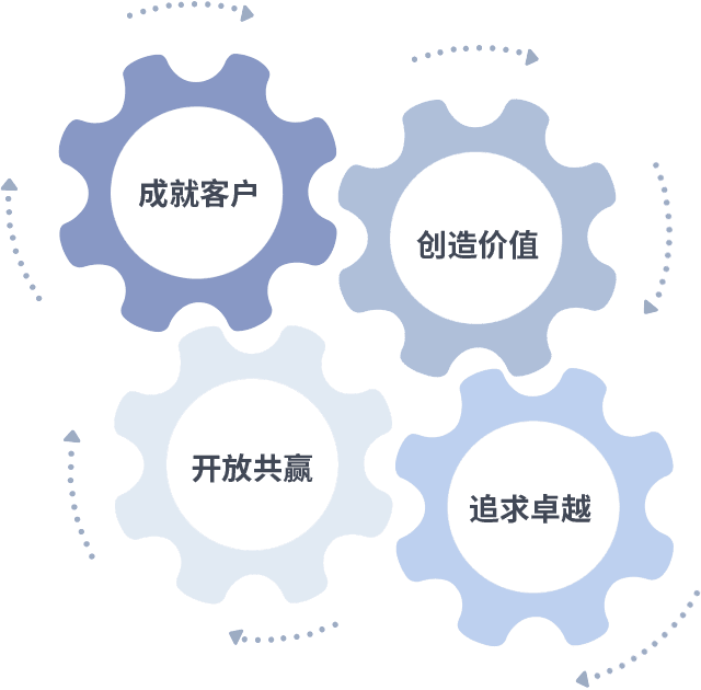 成就客户是一切决策的出发点,,创造价值是衡量所有工作的标准,,,追求卓越是我们做事做人的态度,,开放共赢是我们的格局也是最终的结果。。价值观的齿轮环环相扣,,推动着组织里的每个人不断向前。。。